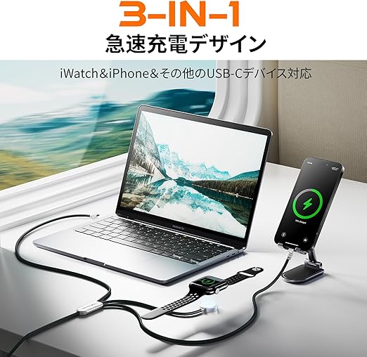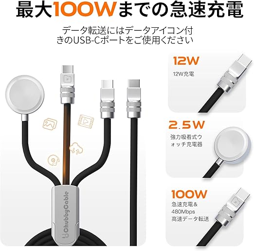 chubbycable 3in1 USB-Cケーブル Apple Watch充電器付き 100W Type-C急速充電対応 高速データ転送ケーブル(ブラック) a