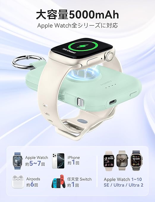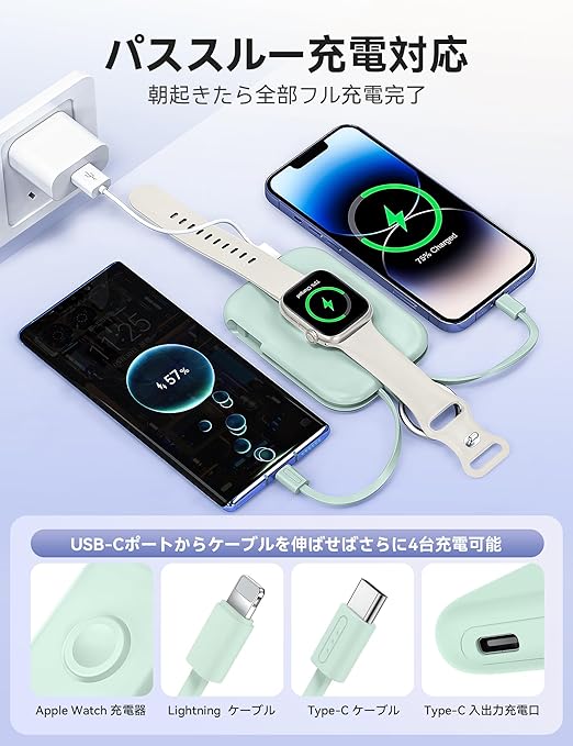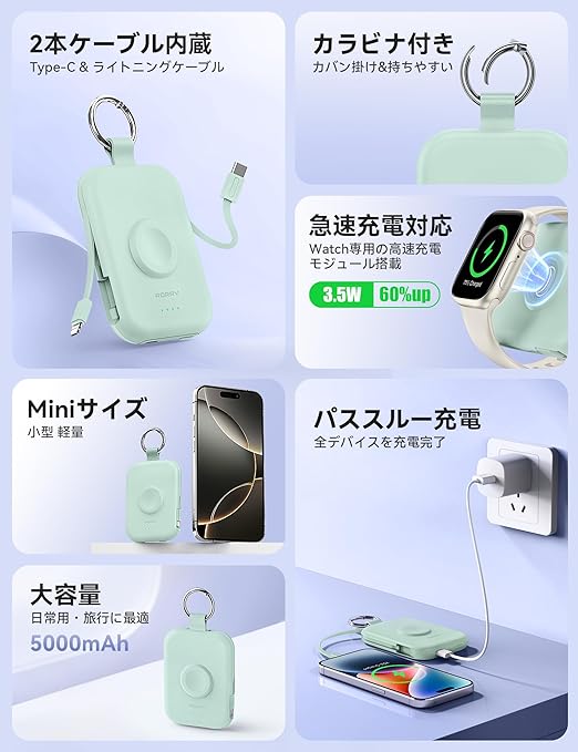 【新色登場】RORRY apple watch 充電器 モバイルバッテリー 5000mAh 2本ケーブル内蔵 【iPhone用+Type-Cケーブル】 アップルウォッチ対応 ワイヤレス充電 同時充電 最大4台同時充電 For Apple Watch ultra2/9/8/7全シリーズに対応 軽量 小型 コンパクト 持ち運び/PSE認証済 for iPhone 15/14/Android グリーン a