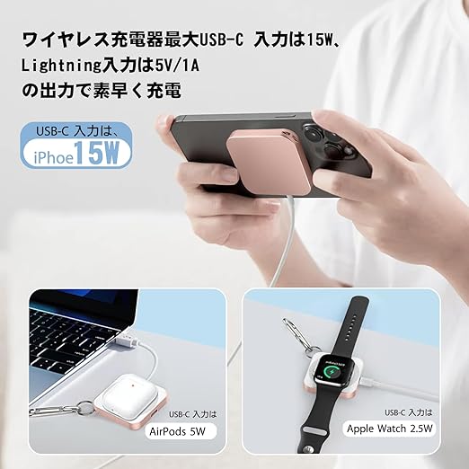 【3 in 1ワイヤレス充電器】新設計の登場!このコンパクトな充電器は、USB-CとLightningケーブルに対応した2つの充電ポートを備えており。USB-C 入力は、iPhoe 15Wで充電できます、アップルウォッチ 2.5Wで充電できます、AirPods 5Wで充電できます。Lightning 入力は、5V/1Aに対応でき。電線の乱れやごちゃまぜがなくなり、スペースがスッキリになれます。忙しい毎日でも、手軽に充電できるから安心です。ただし、携帯電話の温度が上昇すると、充電電力が自動的に減少