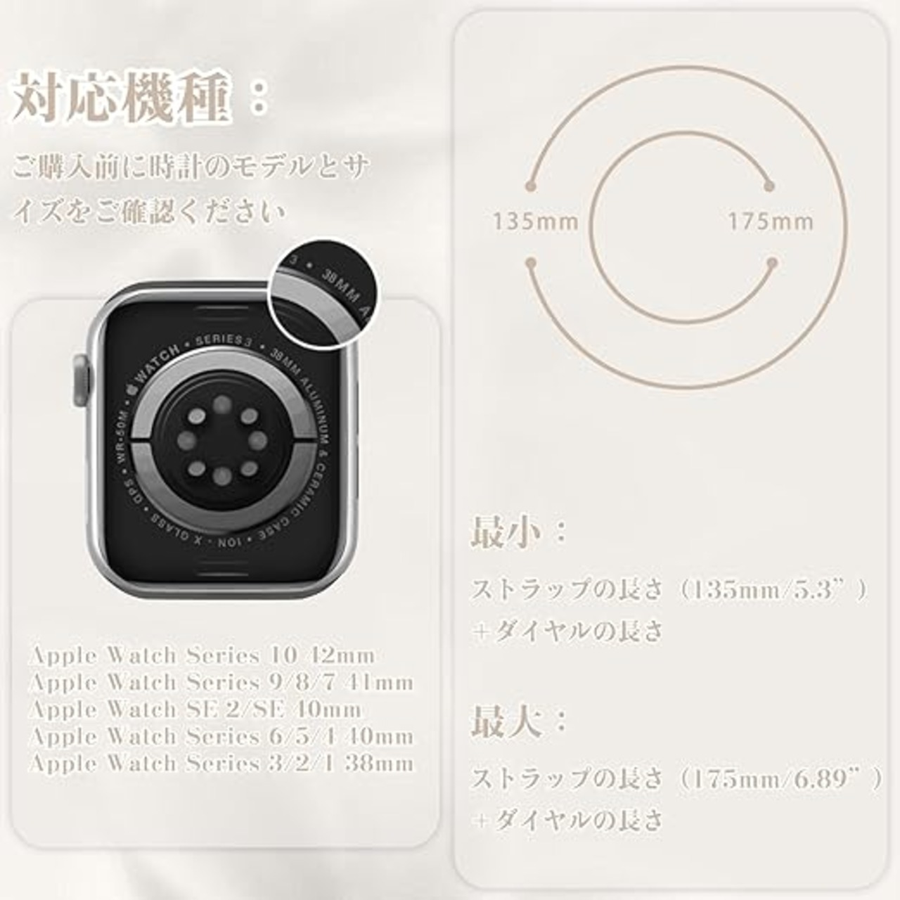 [対応機種] 全機種のコンパチブル Apple Watch SE 3 40mm / Apple Watch Series 11 42mm / Apple Watch Series 10 42mm / Apple Watch SE 40mm /Watch 2 40mm / Apple Watch Series 9 41mm / Apple Watch Series 8 41mm / Apple Watch Series 7 41mm / Apple Watch Series 6 40mm / Ap