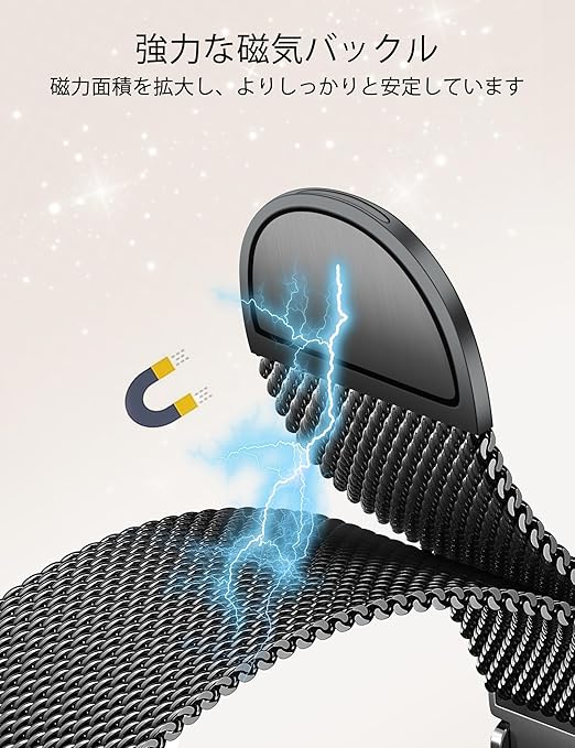 【強力な磁気吸着】:マグネットのデザインなので、自動吸着、取り外しと取り付け簡単であり、またバンドの長さを簡単に調整でき、完璧にフィットします。磁力面積を拡大し、よりしっかりと安定していますので、安心感が増します。