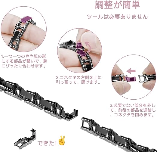 【快適性】気持ち良く着用できるため、腕に合わせて、一つ一つの部品はやや弧の形になっています。 シリコンストラップより通気性が優れています。涼しい触感で、発汗することによるアレルギーなどの肌の不良症状を心配する必要はいりません。 必要に応じて、誰でも簡単に工具なしでベルトの長さを調整できます。手首の周り13〜21cmに適用できます。(スマートウォッチとの接合部のサイズ38mm/40mm/41mm/(42mm Series 10)か、46mm/45mm/44mm/49mm/(42mm Series