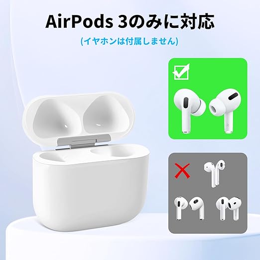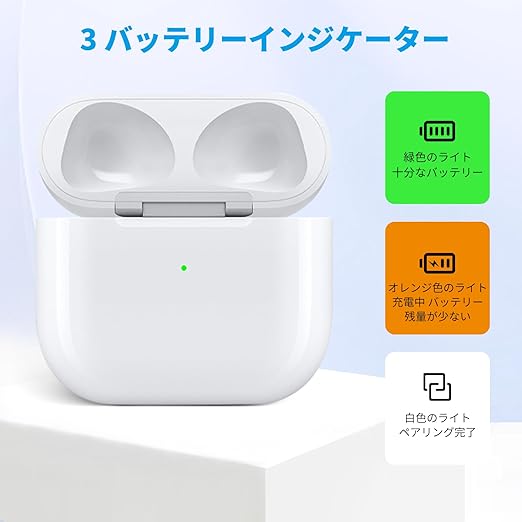 "【エアーポッズ第3世代交換用充電器・対応機種】 本製品はAirPods 第3世代 に対応したLigh-ningポート搭載のエアーポッズ第3世代交換用充電器です。元の充電ケースが紛失・破損・故障した場合の予備・交換用ケースとして最適。正規品のイヤホン(元々のセット)とのみペアリング可能ですので、非純正イヤホンとの互換性はありません。"