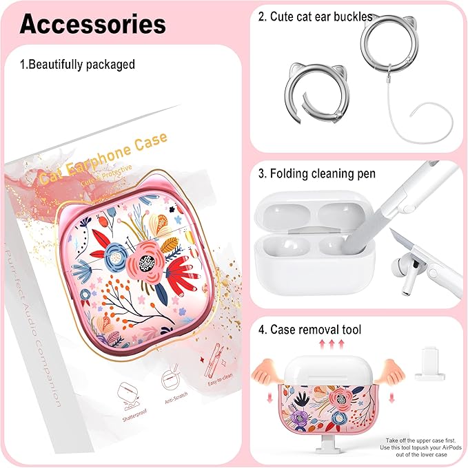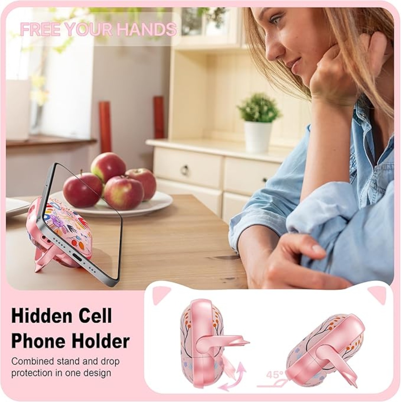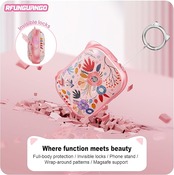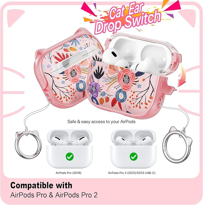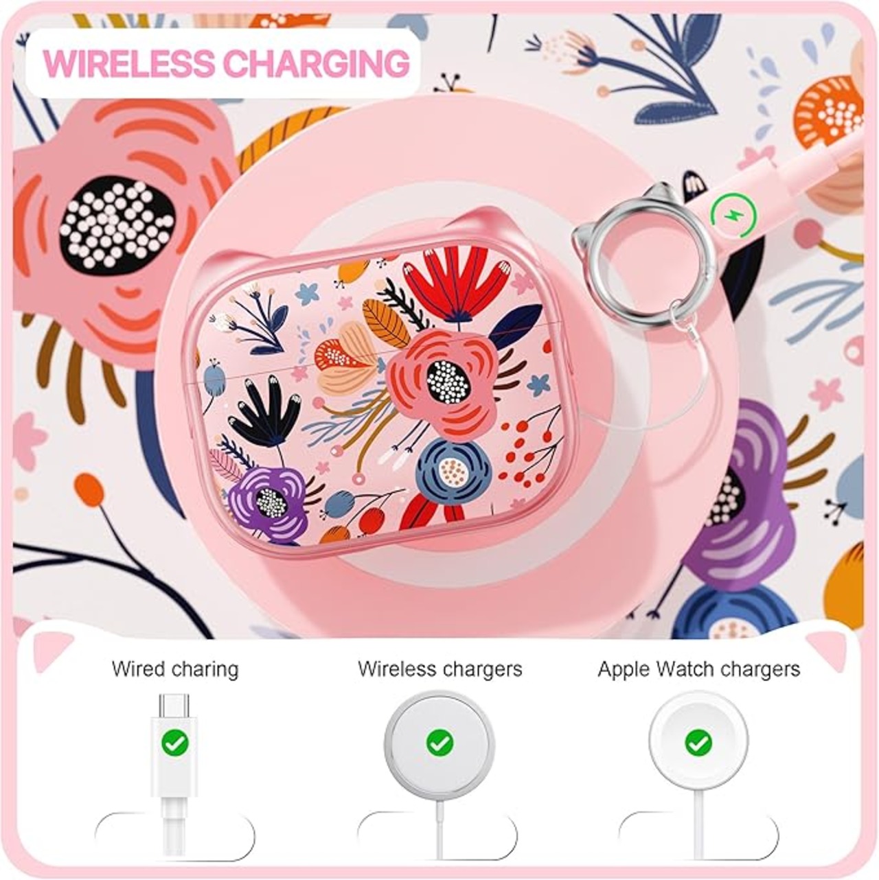RFUNGUANGO AirPods Pro第2世代保護ケースと互換性があり、携帯電話ホルダー機能付き、さまざまな色から選択可能、AirPods Pro 2ケースに適しています、ピンク+ホワイトフラワー a