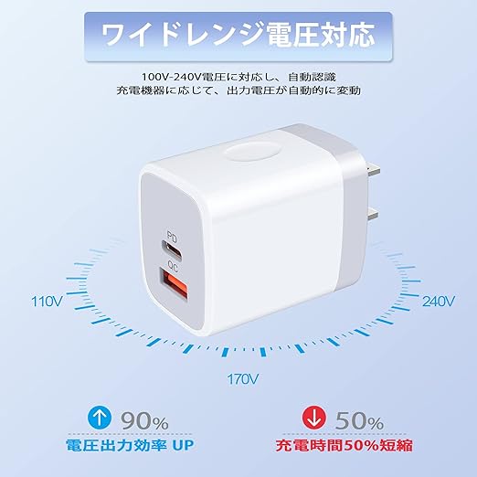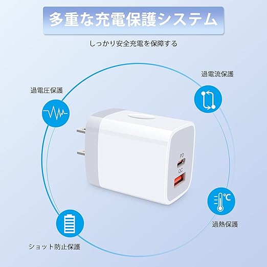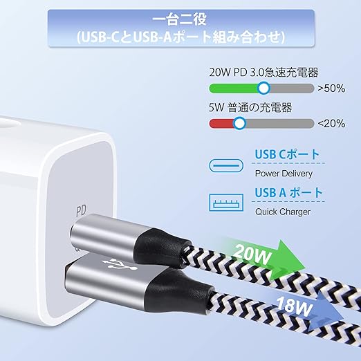 【USB-C&USB-A 2ポート搭載】当社の充電器はPower Delivery3.0対応のUSB CとQuick Charge対応のUSB Aの2ポートを搭載し、どんなケーブルにも対応でき、充電器1個だけで十分。USB-C単ポートで20W、USB-A単ポートで18Wを出力します。同時に充電する場合、自動判別機能を通して、接続されたデバイスに最適な電流を出力します。(ご注意:2ポート同時使う時、通常充電になりますので、急速充電したい場合は、単ポートで使用してください)