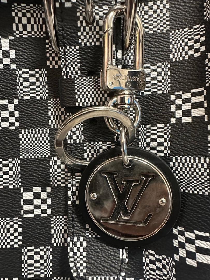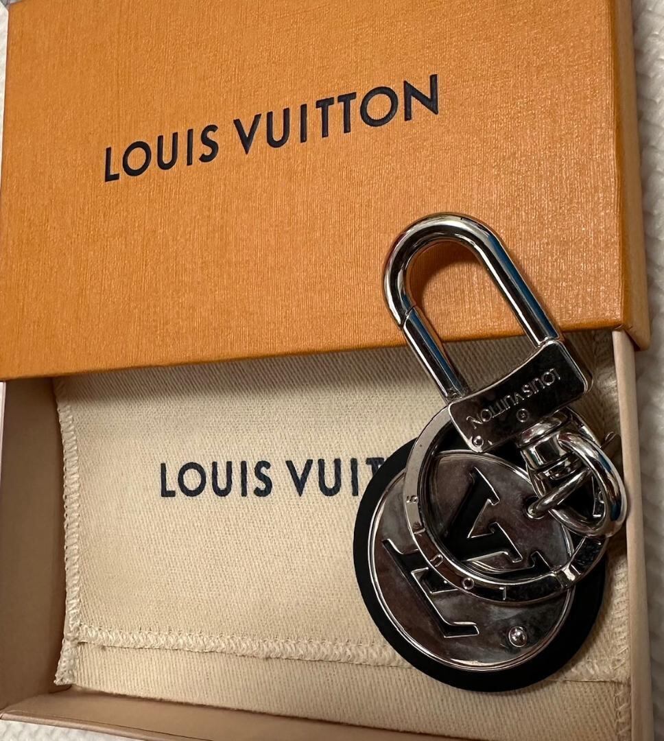 LVロゴ付きのシルバーとブラックのメタルキーホルダー、箱あり。