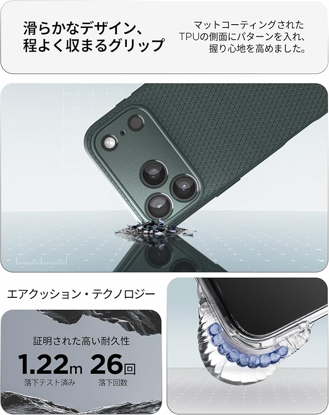 【高耐久のマット素材】マットな仕上げとジオメトリックなパターンが魅力的なリキッド・エア。装脱着が簡単になる柔らかいTPU(熱可塑性ポリウレタン)素材に衝撃を吸収するエアクッションを適用し、極めた保護力でデバイスを守ります。