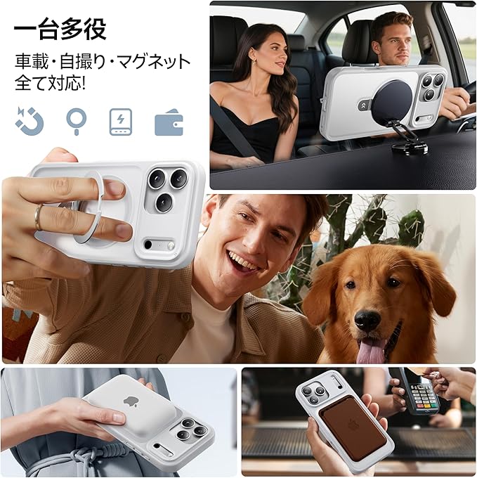 【スゴすぎる!多機能スタンド】MagicStandシリーズのケースは、横向き・縦向き両方で使用可能なスタンド機能を備え、MagSafe対応の無損充電にも対応しています。リング型デザイン、持ち運びも簡単です。スタンド機能は角度調整が自由にできるため、日常のドラマ視聴、動画閲覧、オンライン会議、セルフィー撮影など、さまざまなシーンに対応します。スタンドは強化ヒンジ構造と航空機用アルミ合金素材で設計されており、開閉はスムーズで変形や破損しにくく、45,000回以上の開閉テストでも安定性は変わりません。