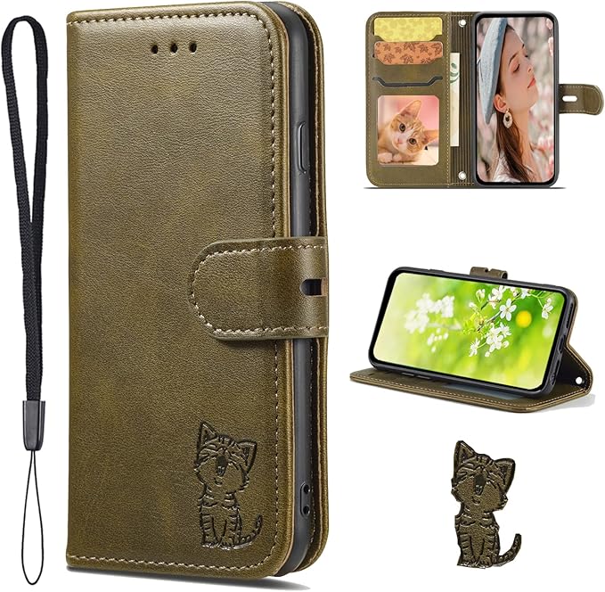 iPhone17Pro ケース 手帳型 iPhone17 Pro カバー あいふぉん手帳型 アイフォン 携帯ケース iPhonecase スマホケース スマホカバー 携帯カバー ストラップ付き カード収納 財布型 ベルトマグネット スタンド機能 かわいい 猫 耐衝撃 全面保護 (iPhone 17 Pro 対応) オリーブグリーン