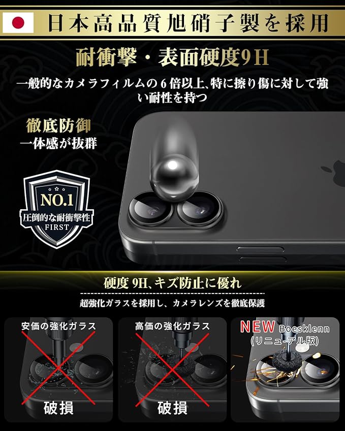Boesklenn 対応 iPhone 17 カメラ保護 対応 iPhone 17 レンズカバー【ぴったりフィット一体感 アルミ合金+9H強化ガラス日本旭硝子素材製】全面保護/高透過率 アイフォン 17 カメラ保護カバー ブラック