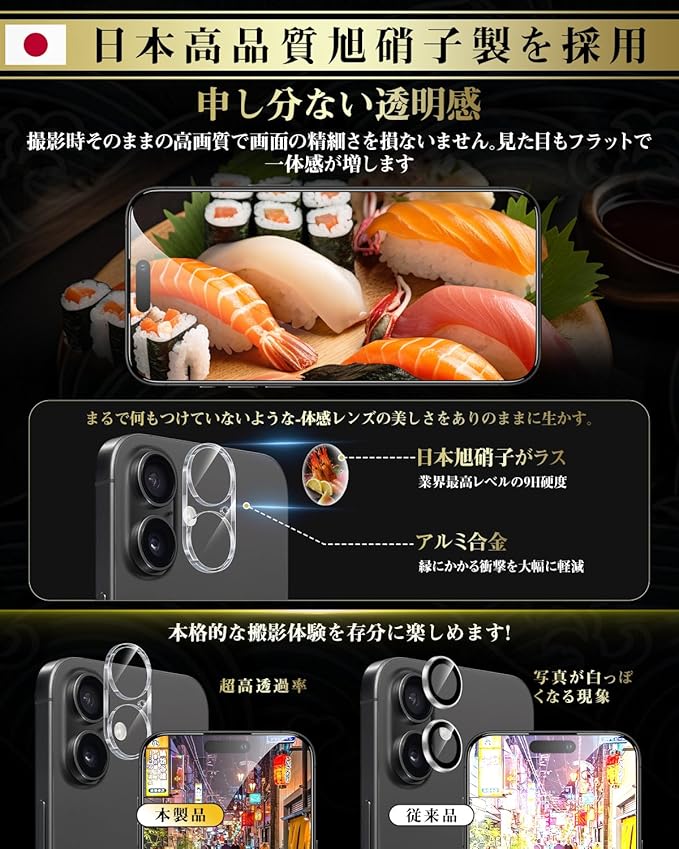 【日本製素材旭硝子製!超高硬度9H・飛散防止!】高いの光通過率を持っていて、フィルムを貼ったままでもトリプルレンズカメラの広がる表現力と細かな性能が全て対応できるので、撮影時に画質をそこなわなくて、被写体の
