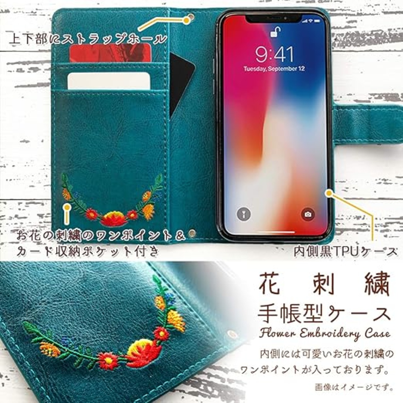 Xperia 10 II SO-41A SOV43 花刺繍 ケース カバー 手帳型 ケース カバー 【ジェードバインターコイズ】 [内側黒TPU] SO-41Aケース SO-41Aカバー SOV43ケース SOV43カバー SO41Aケース SO41Aカバー Xperia10II 2 エクスペリア10II SO41A スマホケース スマホカバー 手帳型ケース 手帳型カバー 【NB】 turquoise a