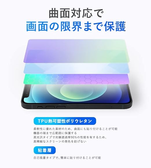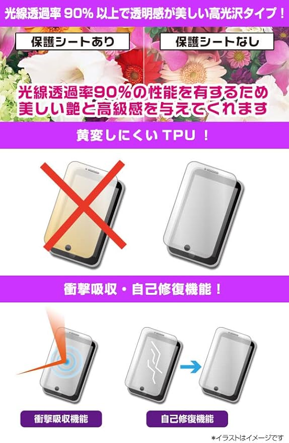 貼っていることを感じさせない透明度、指紋がつきにくい表面処理。そして傷修復機能、衝撃吸収機能を備えております。