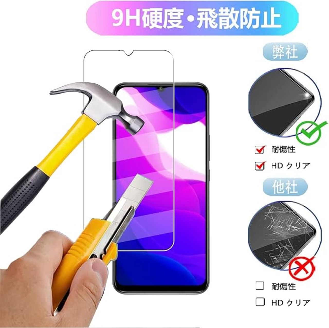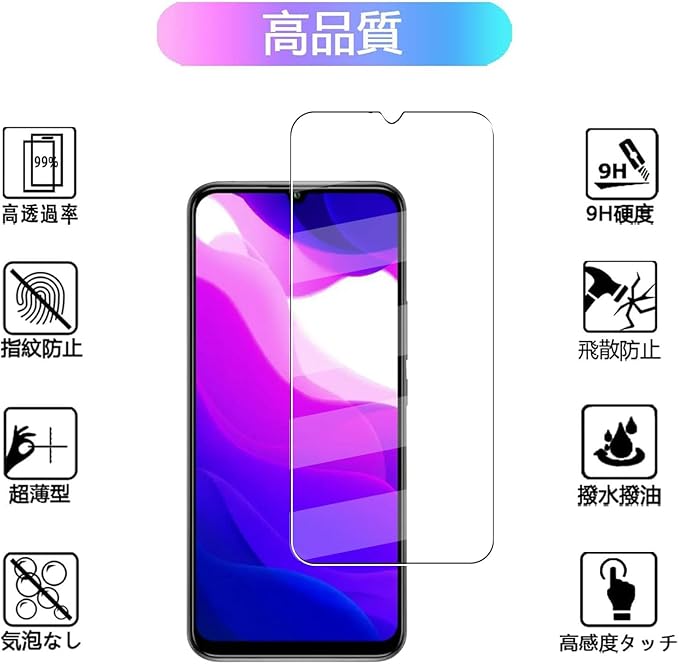 【表面硬度9H】カッターなどの鋭利なものを当たってもキズが付きにくくて高い強度を持ち表面硬度9Hが特徴です。万が一の破損時も飛散防止加工によって破片はフィルムに張り付いた状態で破片がほとんど飛び散らない安全性の高いガラスになっています。