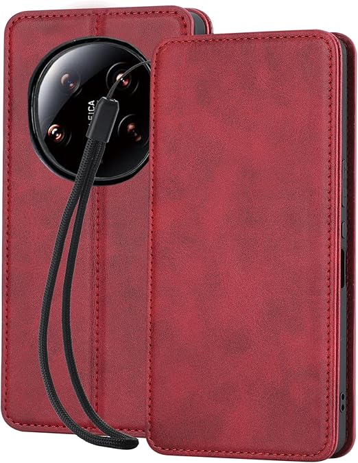Xiaomi 14 Ultra ケース 手帳型 wangChuan シャオミ 14 ウルトラ スマホケース レザー カード収納 内蔵マグネット式(携帯ストラップ付き)レッド a