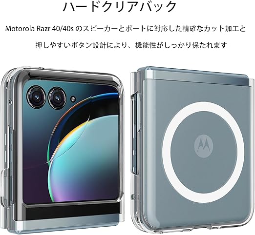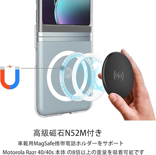 MagSafe対応マグネットケース充電:for Motorola Razr 50/50s ケース クリア TPU+ PC素材 は1,500 gの吸着力を持つ強力な内蔵磁石により,ケースは38個の特殊マグネットを内蔵し、ワイヤレス充電で素早く簡単に装着でき、高品質保護、磁気充電15Wの急速充電が可能です。 他の MagSafe 関連アクセサリと互換性があります。