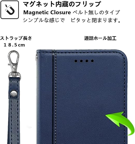 【機能性2:ストラップ付き】ストラップホール付きです。スマホカバーと同じの色合いを持つスプリングシャックル式のハンドストラップも同梱販売です。取替が易くて使い勝手が良いのです。ストラップの長さ:18.5cm。やは