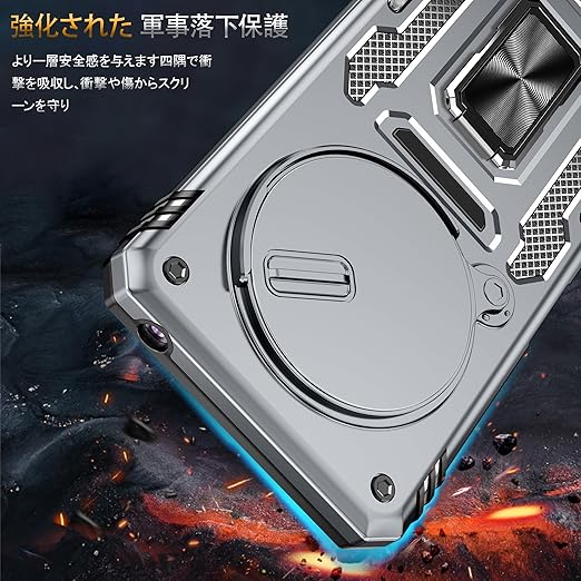 二重構造:PC(ポリカーボネート)バック+TPU(シリコン)バンパー+金属ホールリング、内側TPU素材とハードPCフレームで制作するため、耐久性に優れた、外 部からの衝撃を内部に吸収されて、側に滑り止めの設計で、落下を防止にできます。全カバー式の音量ボタン&スイッチボタンの設計は、ぴったり合うだけではなく、操作しやすいよう最も適したサイズに作られています。