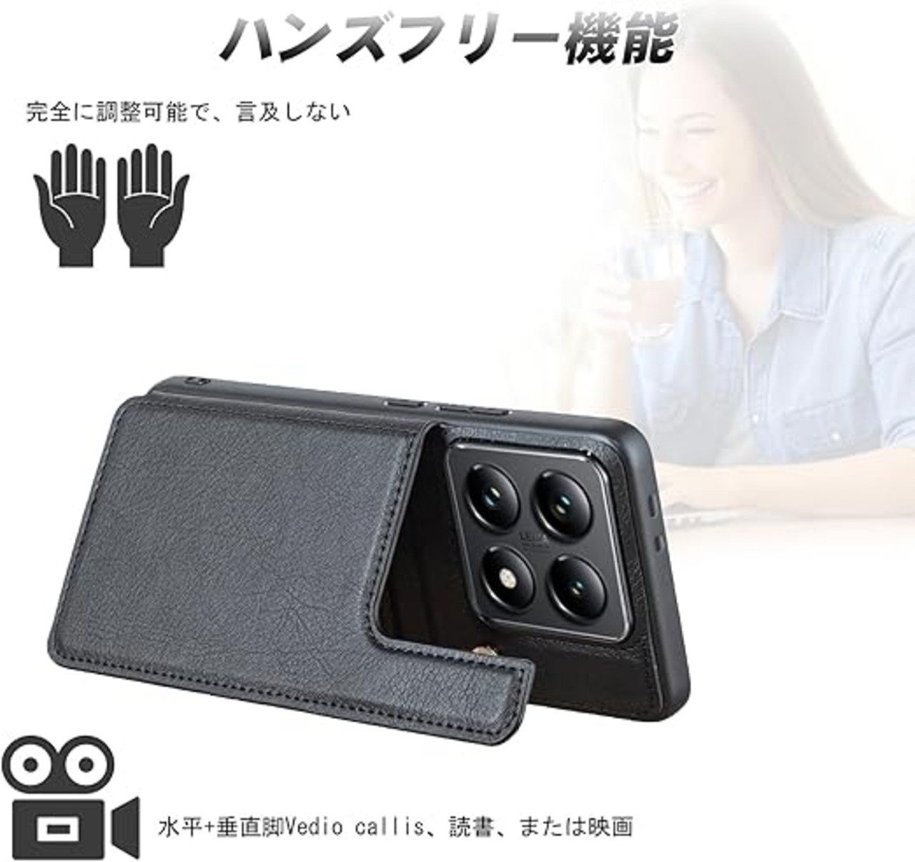 【自由の機能さ】ケースを装着ままで携帯のボタンを全てスムーズに使用し、スマホケースは自由に調整できる横置きスタンド機能が付き、、横向いて斜めに立てて、お好きな角度を調整でき、両手が解放され、お気軽に読書やビデオの観賞を楽しむことができます。