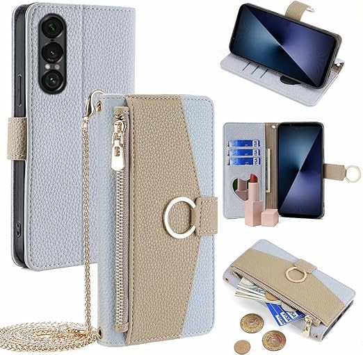 Xperia 1 VII ケース 手帳型 エクスペリア1 vii ケース 手帳型 エクスペリア1vii カバー ショルダー ストラップ付き スタンド機能 カード収納 ミラー付き 耐衝撃 肩掛け おしゃれ 女性 柔らかいTPU TOO&SOO Xperia1VII スマホケース 斜め掛け - ライトブルー a