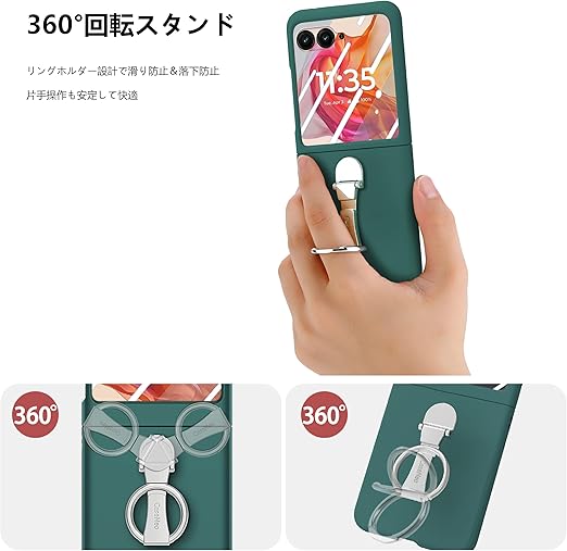 リングスタンド付き:背面に内蔵された金属リングで、スマホを快適かつ安全に持つことができ、簡単には落ちません。さらに、リングは隠しスタンドとしても使え、縦横自由に調整可能。ハンズフリーで快適に使用できます。