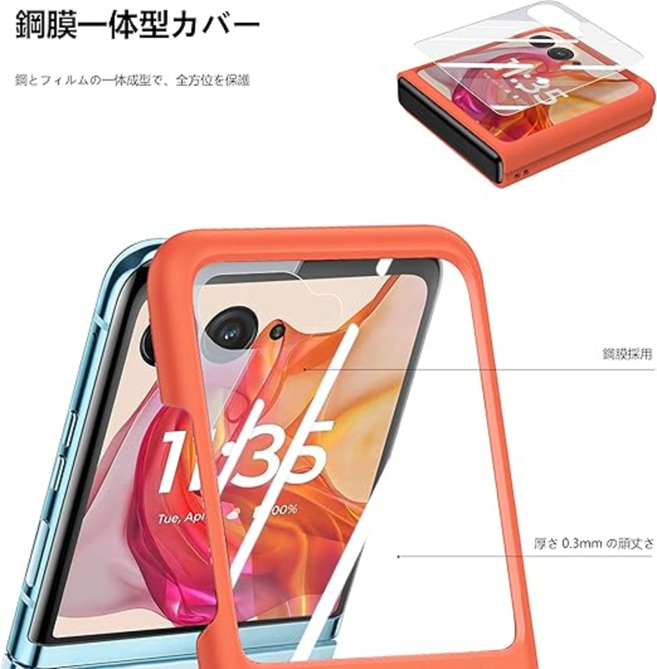 強化ガラスフィルム付き:ケースとフィルム一体型設計で、落下や擦り傷からスマホをしっかり保護。