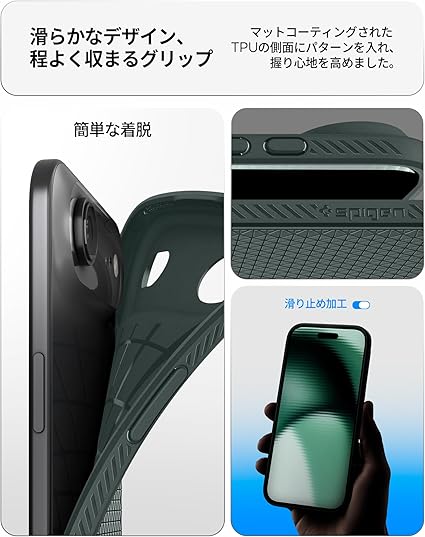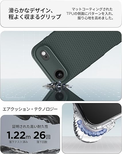 【高耐久のマット素材】マットな仕上げとジオメトリックなパターンが魅力的なリキッド・エア。装脱着が簡単になる柔らかいTPU(熱可塑性ポリウレタン)素材に衝撃を吸収するエアクッションを適用し、極めた保護力でデバイスを守ります。
