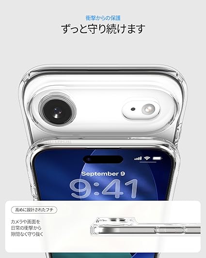 【高耐久のクリア素材】装脱着が簡単になる柔らかいTPU(熱可塑性ポリウレタン)に丈夫なPC(ポリカーボネート)をハイブリッドさせた2重構造でデバイスを守ります。背面のPCにはUVコーティング、側面のTPUには青いレ