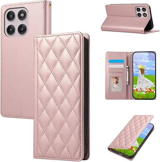 Gedurya motorola edge 60 pro 用 ケース 手帳型 motorola edge 60s pro ケース 携帯カバー RFIDブロッキング カード収納 財布型 モトローラ エッジ60 pro スマホケース 6.7インチ対応 マグネット式 スタンド機能 全面保護 耐衝撃 ひし形 グリッド 刺繍 パターン - ピンク a