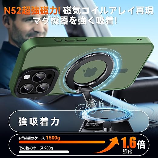 [超強力マグネット搭載・超強吸着力] 対応機種: いphone15 Pro ケースの内部には、38個のN52マグネットを採用。従来比150%向上した磁力で、充電器やMagSafe対応アクセサリーにピタッと確実に吸着。激しく振っても外れないため、スタンドやカー