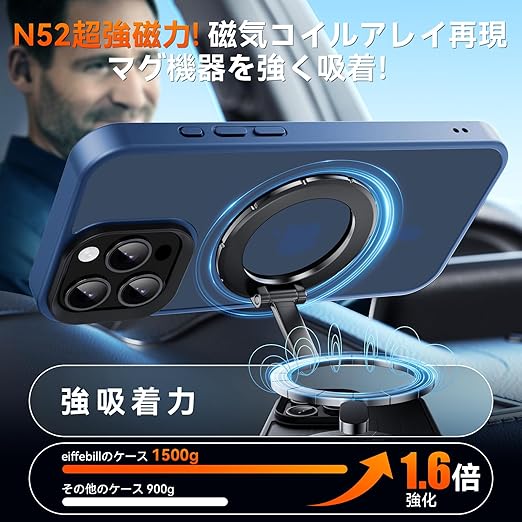 [超強力マグネット搭載・超強吸着力] 対応機種: いphone15 Pro ケースの内部には、38個のN52マグネットを採用。従来比150%向上した磁力で、充電器やMagSafe対応アクセサリーにピタッと確実に吸着。激しく振っても外れないため、スタンドやカー