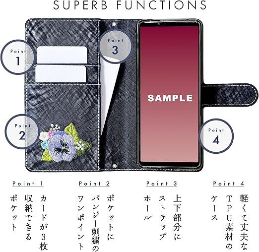 内側にはカードなどが収納できるポケット付きの、実用的なハンドあり手帳型ケースです。高級感のあるサフィアーノ調生地に華やかで上品なオリジナルデザインのパンジー刺繍を施しています。ストラップ穴付きのため、チェーンを付けたりストラップを付けることが可能となります。