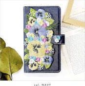 内側にはカードなどが収納できるポケット付きの、実用的なハンドあり手帳型ケースです。高級感のあるサフィアーノ調生地に華やかで上品なオリジナルデザインのパンジー刺繍を施しています。ストラップ穴付きのため、チェーンを付けたりストラップを付けることが可能となります。