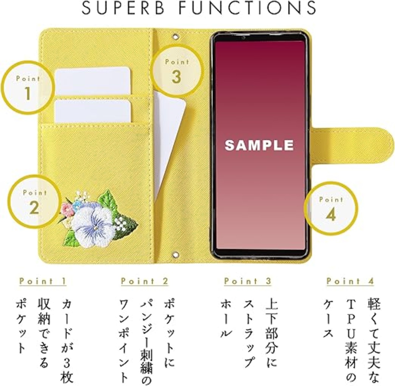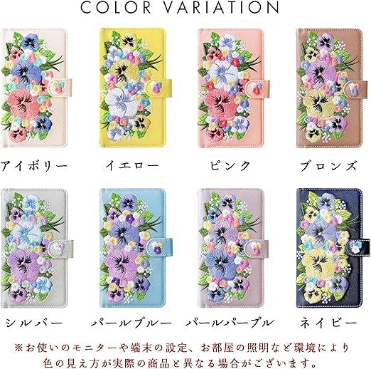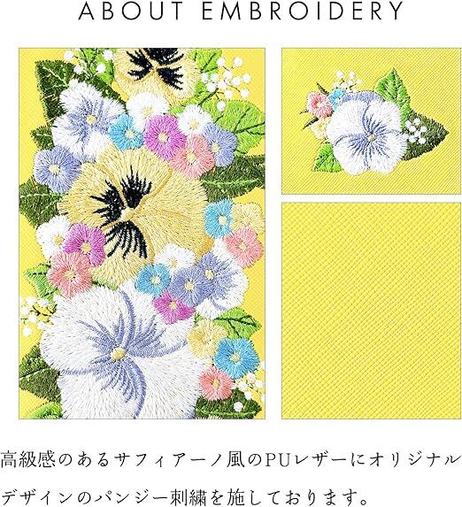 内側にはカードなどが収納できるポケット付きの、実用的なハンドあり手帳型ケースです。高級感のあるサフィアーノ調生地に華やかで上品なオリジナルデザインのパンジー刺繍を施しています。ストラップ穴付きのため、チェーンを付けたりストラップを付けることが可能となります。