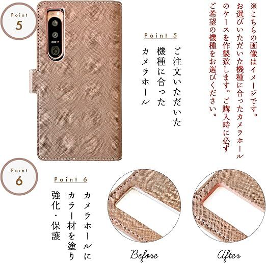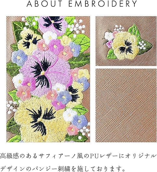 内側にはカードなどが収納できるポケット付きの、実用的なハンドあり手帳型ケースです。高級感のあるサフィアーノ調生地に華やかで上品なオリジナルデザインのパンジー刺繍を施しています。ストラップ穴付きのため、チェーンを付けたりストラップを付けることが可能となります。