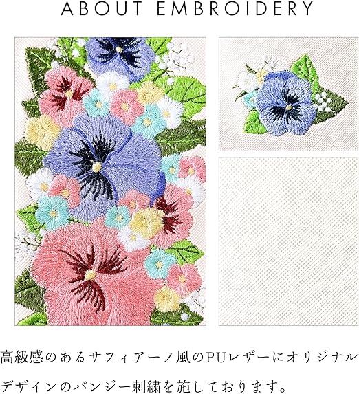 内側にはカードなどが収納できるポケット付きの、実用的なハンドあり手帳型ケースです。高級感のあるサフィアーノ調生地に華やかで上品なオリジナルデザインのパンジー刺繍を施しています。ストラップ穴付きのため、チェーンを付けたりストラップを付けることが可能となります。