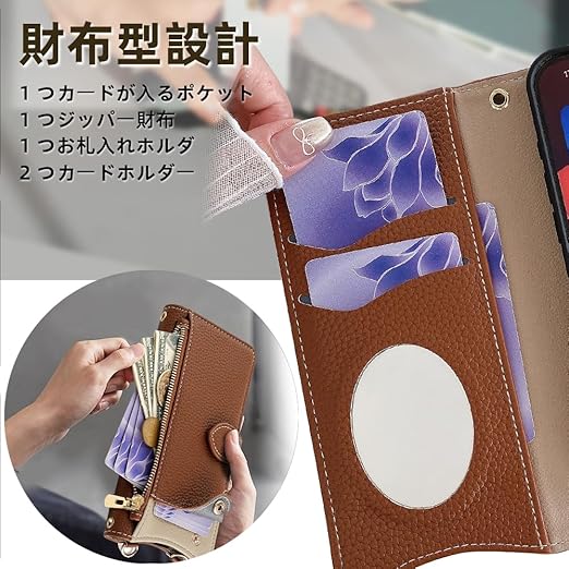 QANKISIS for xiaomi poco f7 ケース 手帳型 財布型カバー マグネット留め ポコf7 カバー 鏡付き 銭入れ マグネット式 化粧鏡 カード収納 斜めがけ ストラップ 首掛け PUレザー 肩掛け 横置きスタンド機能 携帯カバー 全面保護 ファッション 6.83インチ(ブラウン) a