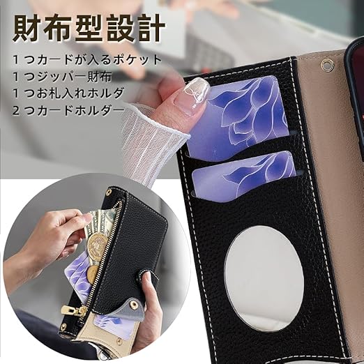 QANKISIS for xiaomi poco f7 ケース 手帳型 財布型カバー マグネット留め ポコf7 カバー 鏡付き 銭入れ マグネット式 化粧鏡 カード収納 斜めがけ ストラップ 首掛け PUレザー 肩掛け 横置きスタンド機能 携帯カバー 全面保護 ファッション 6.83インチ(ブラック) a