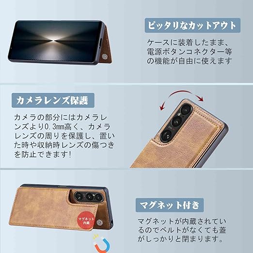 【上質素材】:耐久性のあるTPUと柔軟性のある上質レザーを採用されて、傷やカジリを防ぐことが出来ます。また、指紋、油分などもつきにくく、カメラレンズ保護構造でスマホ本体を傷から360度しっかり保護してくれます。