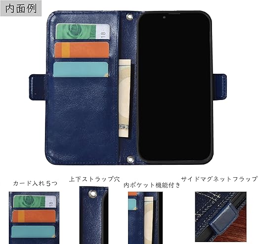 機能:内面にはカード収納ポケットと多用途の大き目の内ポケットが配置しております。インナーケース部分には割れないフルカバーのTPU素材を採用。閉じる際のマグネットはサイドフラップに施し、複数のカードを収納してもしっかり留まります。