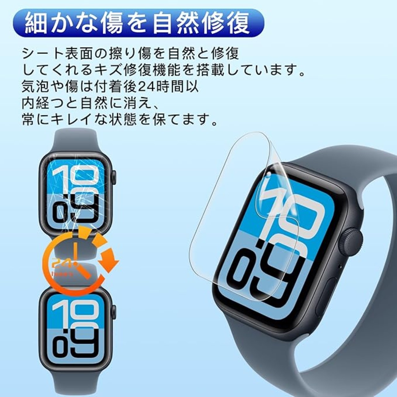 【自己修復機能】 従来の製品は、使い続けていくうちに保護ガラスが傷付き、画面が曇って見えるようになってしまっていました。本製品は、保護ィルムの表面に軽微なキズを自己修復する特殊素材を採用!いつまで