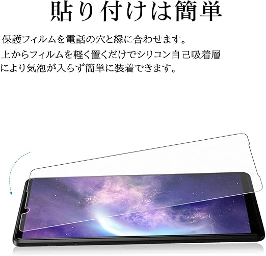 『 対応機種 』Xperia10 VI 用 (SO-52E SOG14) に適応しています。携帯は端部のカーブがフィルム剥がれ、浮きの防止、スマホケース装着スペース確保のため、機器の曲面の縁にスペースを残すデザインとなっています。
