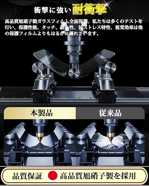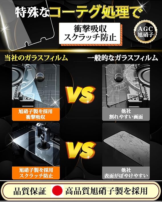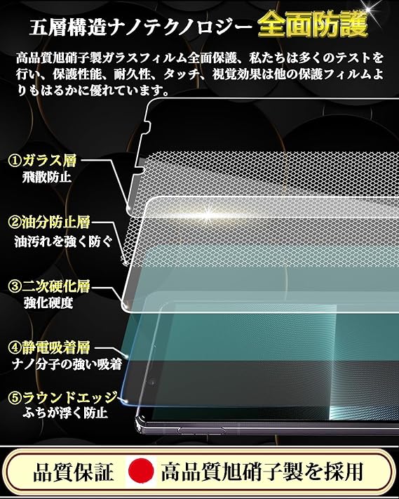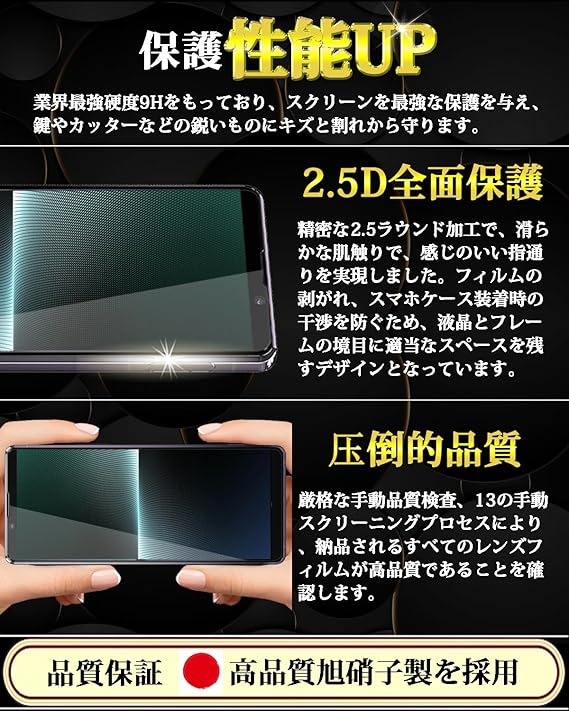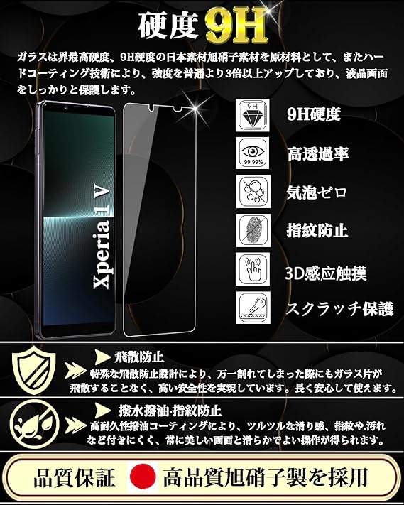 【日本製素材旭硝子製】Xperia 1 V ガラスフィルムは日本製旭硝子ガラスを使用し、表面硬度9Hなので、キズが付きにくい保護フィルム。ナイフや鍵などの尖ったものでも簡単には傷がつきません。万が一ガラスフィルムが破損した際にガラス片が飛散しない飛散防止処理も施されています。フルカバーデザインでサイドからの衝撃を和らげ、縁まで携帯電話のスクリーンを守っていきます。