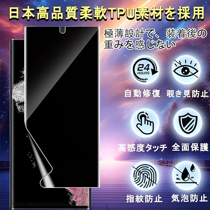 【新型TPU素材、滑り心地抜群】TPU素材特有の弾力性と柔軟性により、ガラスフィルムでは貼られないエッジ部分までしっかり保護できます。 スクラッチ防止、傷つきにくい、付着後の時間の経過と共に自然に消えます, 特殊コーティングにより、表面は滑らかです。指紋や汚れなど付きにくく、拭けばすぐに綺麗になり、いつでも画面がツルツルの状態で操作できます。