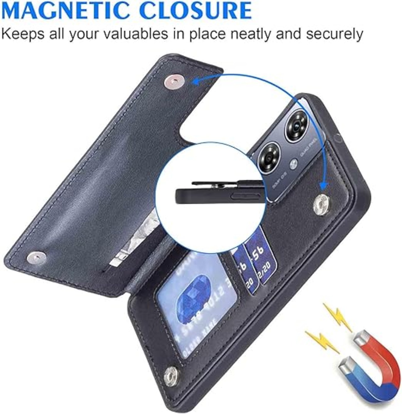 ●カードレシートや名刺など、丈夫で安全な折り畳み式携帯電話ケースを収納できます。マグネットは電話ケースの側面に内蔵されており、カードに直接触れないため、磁気カードの損傷を心配する必要はあり