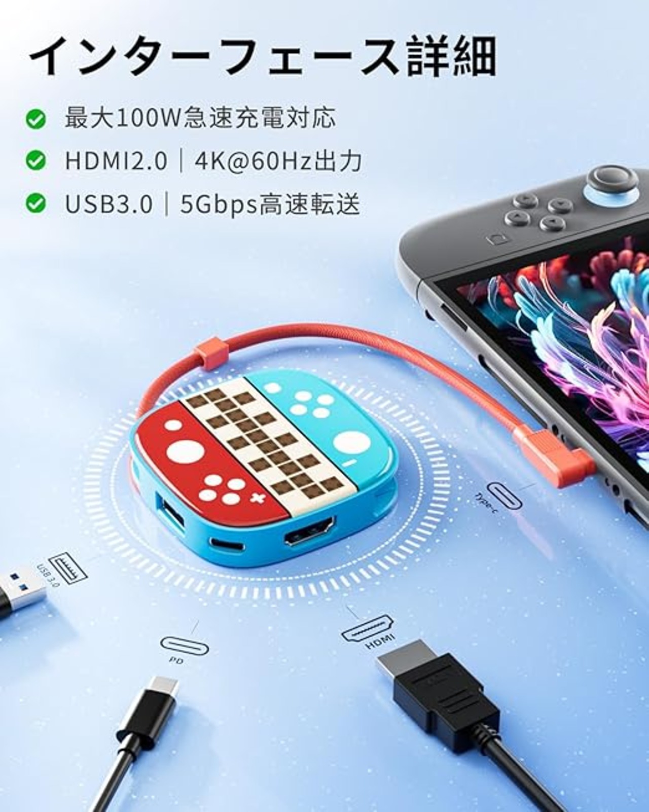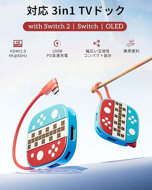 Switch 2用専用ドック、Switch & Switch 有機ELに対応したテレビ出力ドック、4K@60Hz、USB 3.0、5Gbps 高効率伝送、3in1 軽量設計、HDMI変換/TVモード/充電モード対応、遅延なし、持ち運び便利、Switch ドック代替品 a