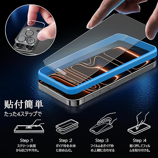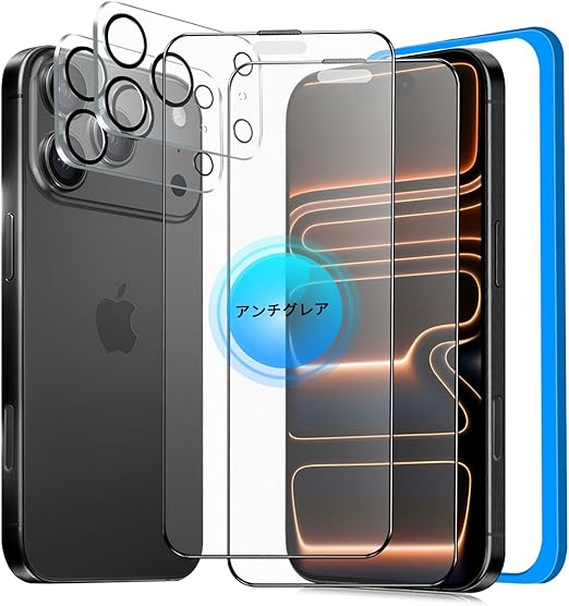 【対応機種】 iPhone 17 Pro(6.3インチ)対応。【パッケージ内容】 iPhone17Pro アンチグレアガラスフィルム ×2枚+iPhone 17Pro カメラフィルム ×2枚+貼り付けガイド枠 ×1個+クリーニングセット ×2セット+取扱説明書 ×1部。【製品の特徴】 アンチグレア・全面保護・気泡なし・耐衝撃・剥がれにくい・割れにくい。