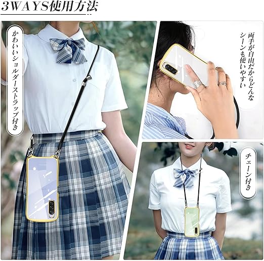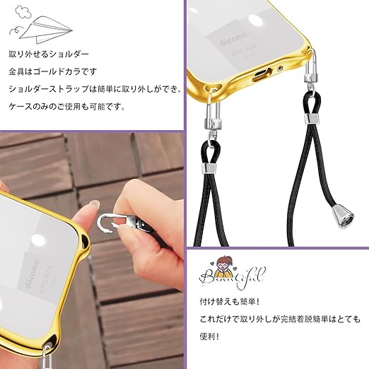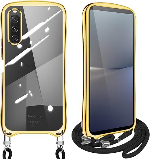Xperia 10 V ケース ショルダー クリア SO-52D SOG11 エクスペリア10v スマホケース カバー 耐衝撃 透明 TPU ストラップ付き 肩掛け 首掛け 紐付き 斜めがけ シリコン メッキ加工 取り外し可能 長さ調整可能(ゴールド) a