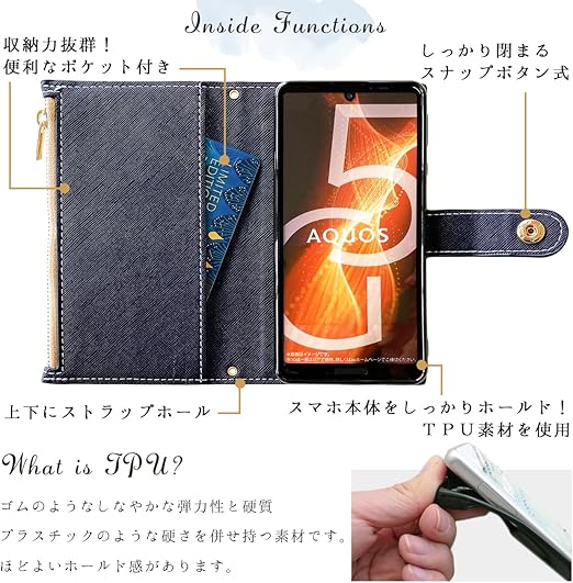 ◎手帳部分と内側ケース部分は接着しておりますが、強くめくったりひっぱると剥がれる場合がございます。内側のケースは黒TPUを使用し、本体をしっかりカバーします。電源ボタンや音量ボタンなどは、黒TPUケースの上から押す仕様となっております。カメラ部分などは機種に合わせた開口部が開いております。