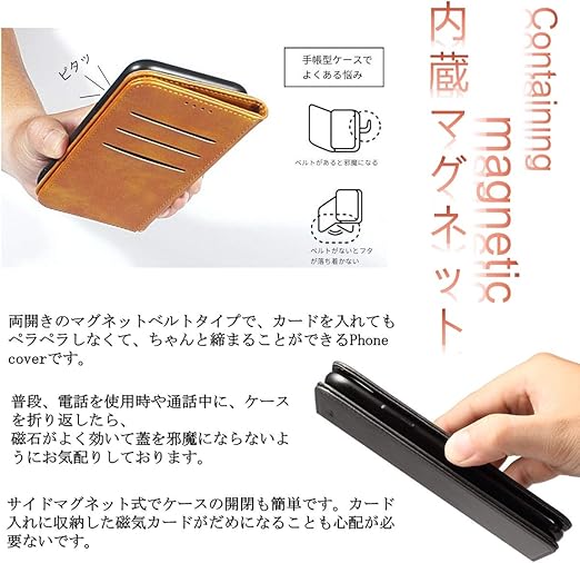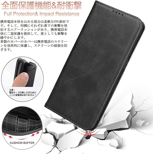 ①【上質な素材】外部は上質な合皮レザー素材を採用しており、放熱性が良く、傷や埃を防ぐことができます、滑りにくく、指紋、油分などもつきにくく。インナーケースは弾力性の柔軟黒TPU素材を採用しており、角までしっかり保護できるケースです、柔軟性があり本体への装着脱着も簡単です。衝撃吸収機能あり、しっかりの二重保護でお携帯を守り抜きます。